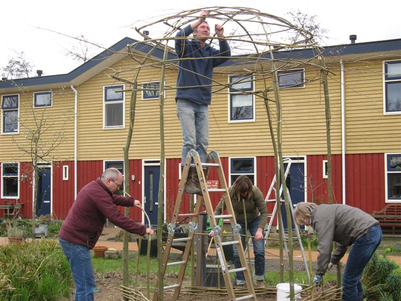Men kent elkaar bij naam, maakt regelmatig een praatje en een enkeling helpt bij het onderhoud van de mandelige (gemeenschappelijke) tuin. De tuin is oorspronkelijk aangelegd door Kleurrijk Wonen en inmiddels aangepast aan de wensen van de bewoners. Zo is er een moestuintje en een bloemenpluktuin. Hoogtepunt in de hof is het wilgenprieeltje, door de bewoners samen met een deskundige aangelegd. Ieder draagt verder een bescheiden bedrag per maand bij voor het onderhoud van de hof.
