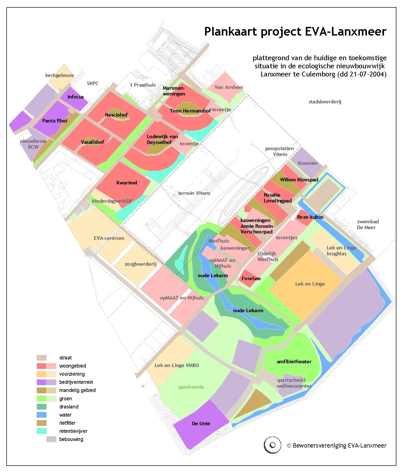 Plankaart EVA-Lanxmeer: plattegrond van de huidige en toekomstige situatie in de ecologische nieuwbouwwijk Lanxmeer te Culemborg (21-07-2004)