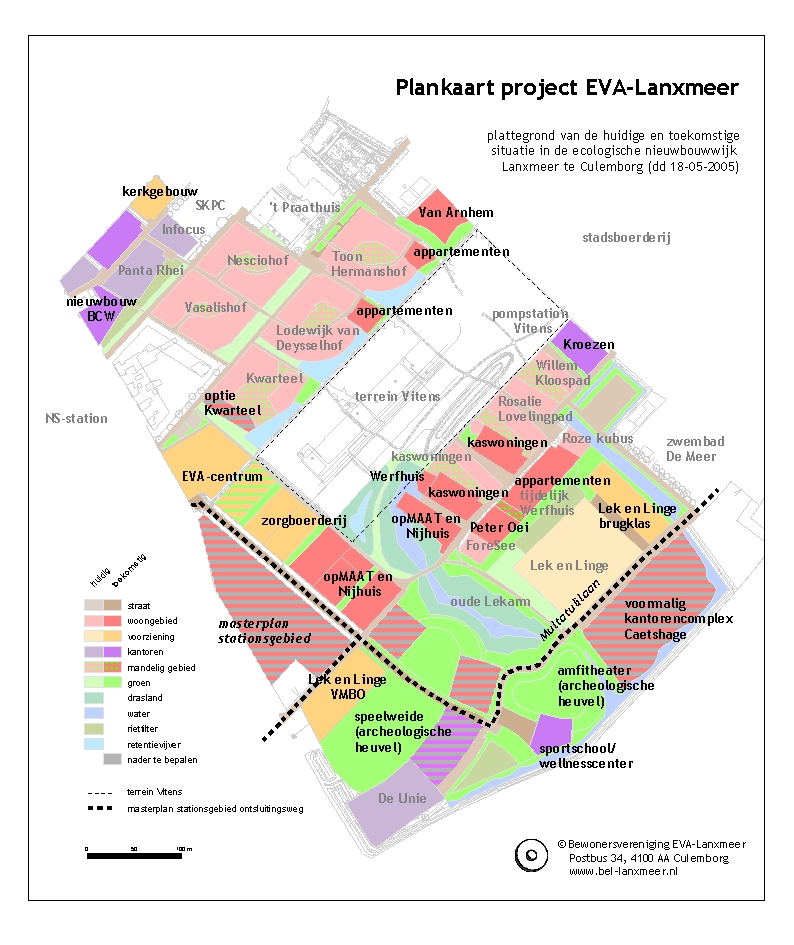 Plankaart EVA-Lanxmeer: plattegrond van de huidige en toekomstige situatie in de ecologische nieuwbouwwijk Lanxmeer te Culemborg 18-05-2005